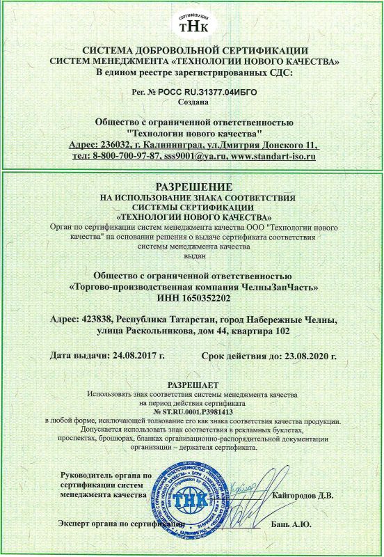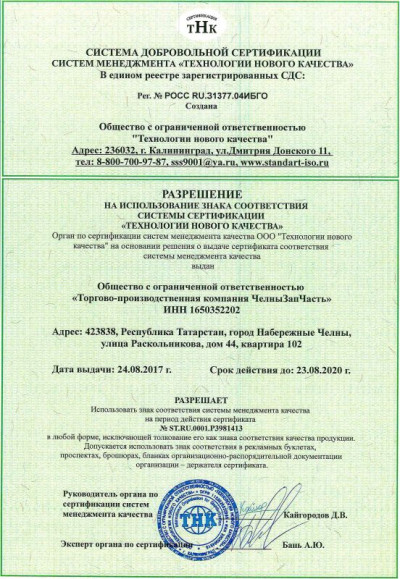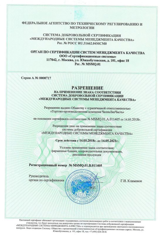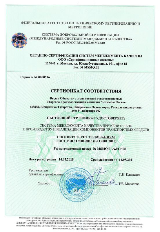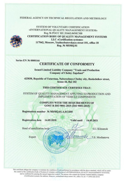 Система управления качеством предприятия сертифицирована по международным стандартам смк ISO 9001-2015, а также дополнительно по ГОСТ Р ИСО/ТУ 16949-2009 «Системы менеджмента качества. Особые требования по применению ИСО 9001:2008 в автомобильной промышленности и организациях, производящих соответствующие запасные части».